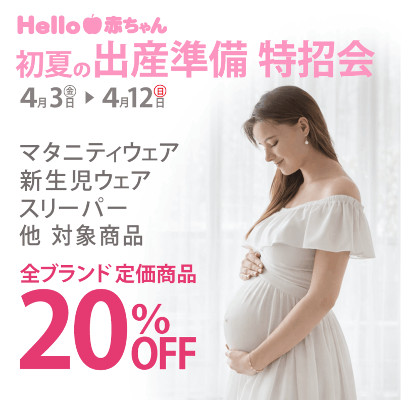 「初夏の出産準備特招会」では、新生児衣料(肌着を含む)、マタニティ衣料(肌着を含む)、スリーパーの全ブランド 定価商品が20%OFFとなります!