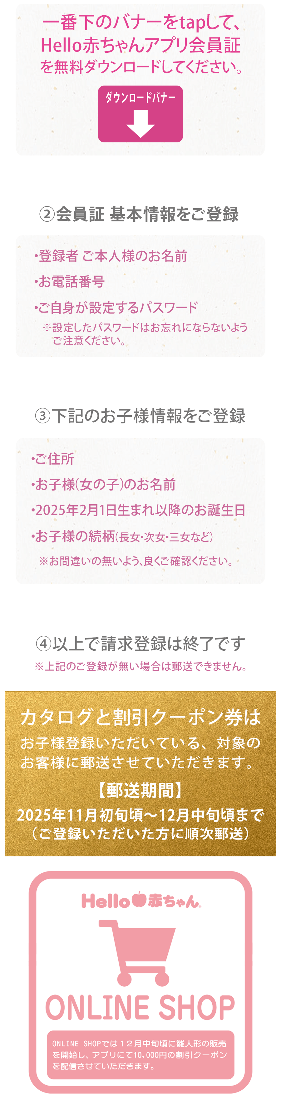 ・2025年10月15日までにハロー赤ちゃんメンバーズの対象となるお子様(女の子)を登録頂いている会員様へは郵送させていただいております。