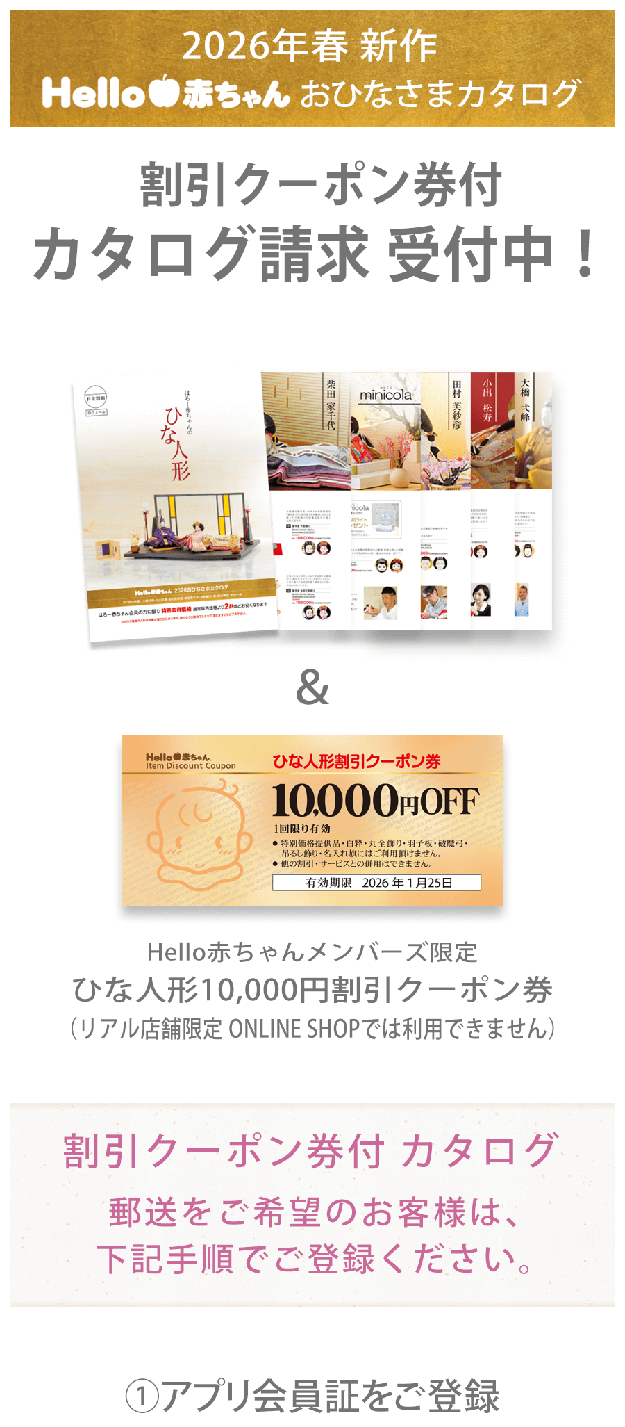 又、日頃のご愛顧に感謝し、早期ご予約特典といたしまして2026年1月25日(日)までご利用いただける雛人形割引クーポン券を、ハロー赤ちゃんメンバーズご入会の皆さまに差し上げております。