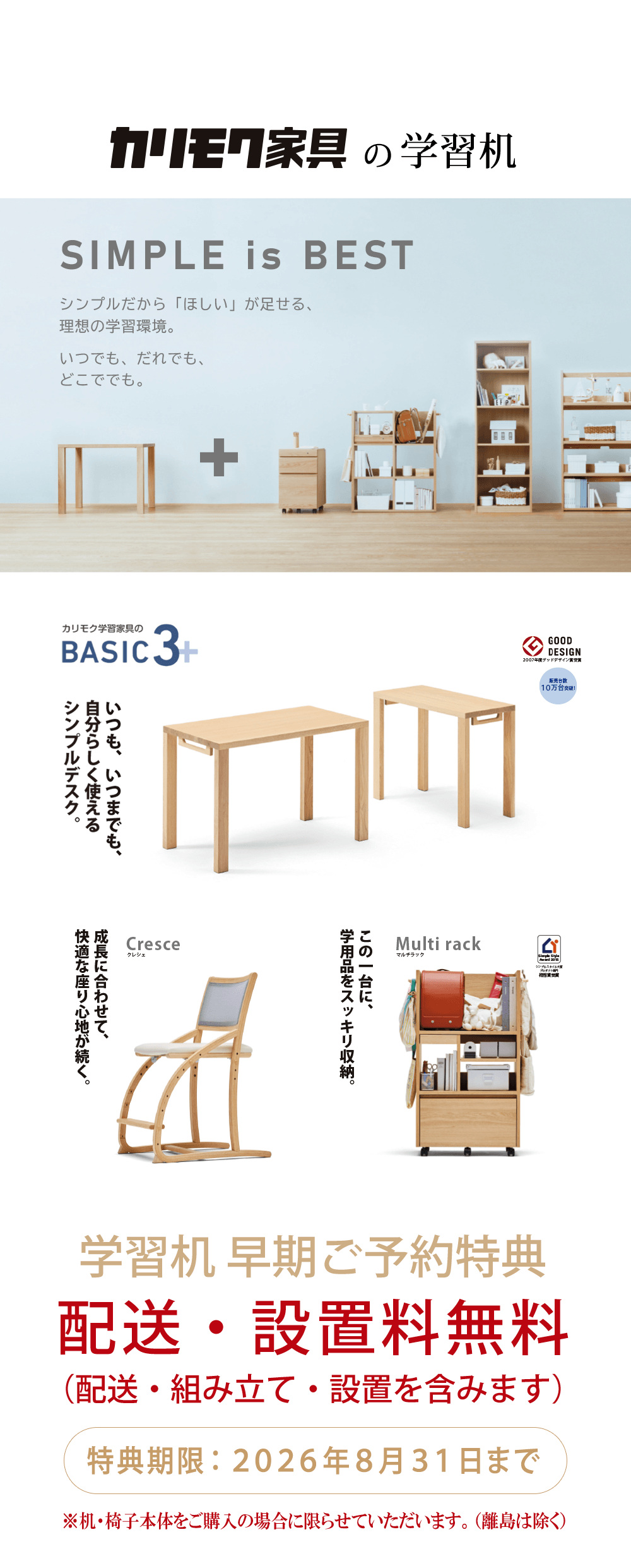 また、学習机をご予約(ご精算)頂いたお客様には、早期ご予約特典として、配送・組み立て・設置を無料にさせていただきます。
