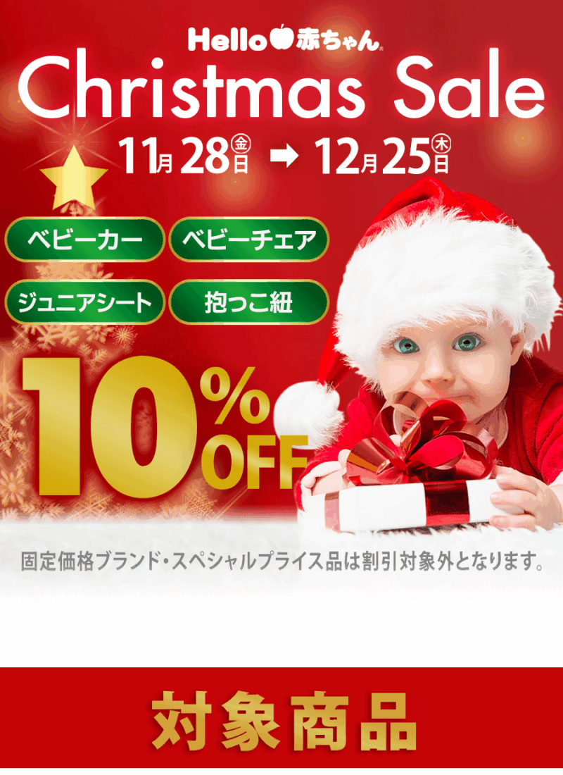 「Christmas Sale」では、スペシャル特典として、ベビーカー・ベビーチェア・ジュニアシート・抱っこ紐の定価商品が10%OFFとなります!