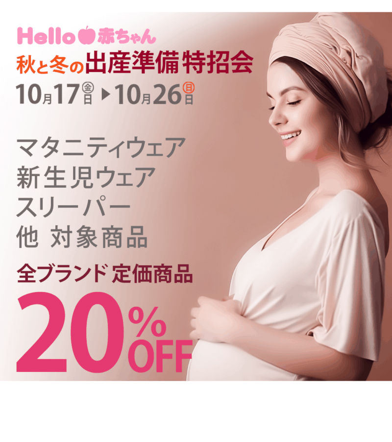 「秋と冬の出産準備特招会」では、新生児衣料(肌着を含む)、マタニティ衣料(肌着を含む)、スリーパーの全ブランド 定価商品が20%OFFとなります!
