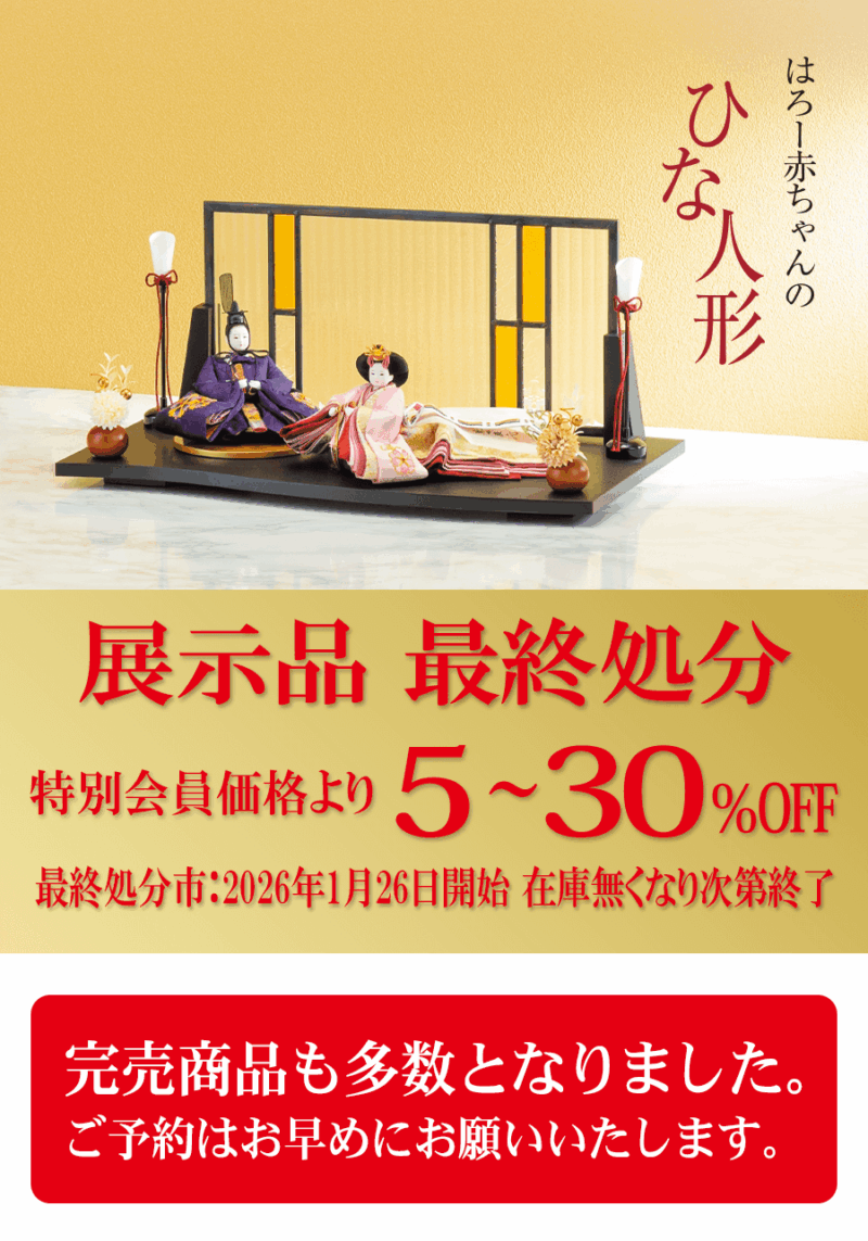 ハロー赤ちゃんでは、2026年1月26日から雛人形の展示品 最終処分セールを開催いたします!