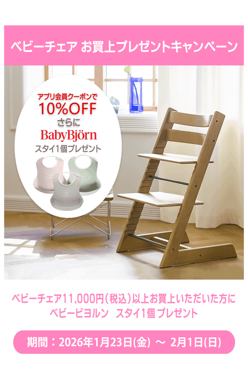 ベビーチェア11,000円(税込)以上お買上いただいた方に、ベビービヨルンスタイを1個プレゼントいたします!