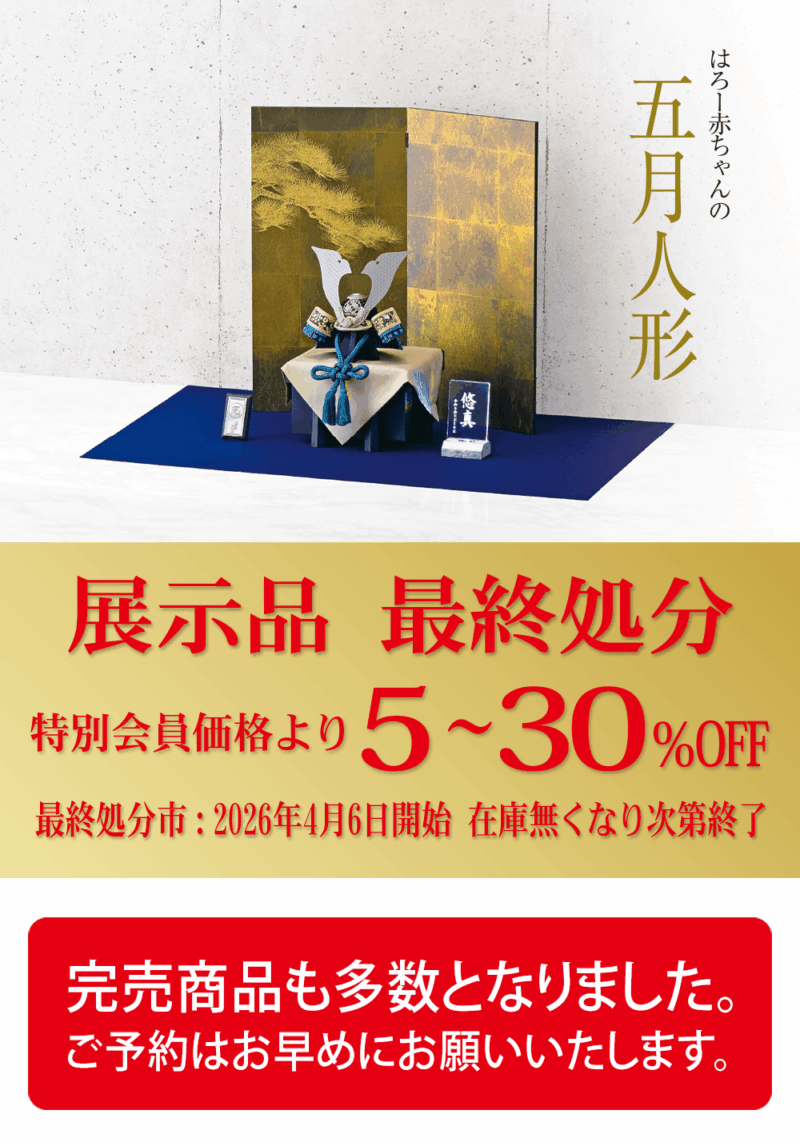 展示品 最終処分価格として、五月人形全品、特別会員価格からさらに5~30%OFFでの販売となります。